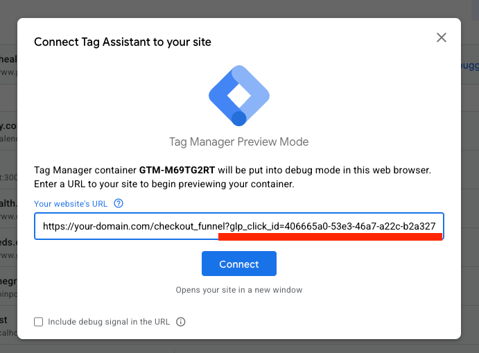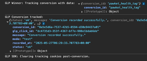 - Visit your site with a test click ID: ?glp_click_id={{TEST_UUID}}. Should look something like yoursite.com?glp_click_id=ad130179-664f-45e8-9beb-2f2d0d9bfbed