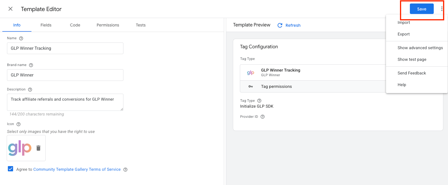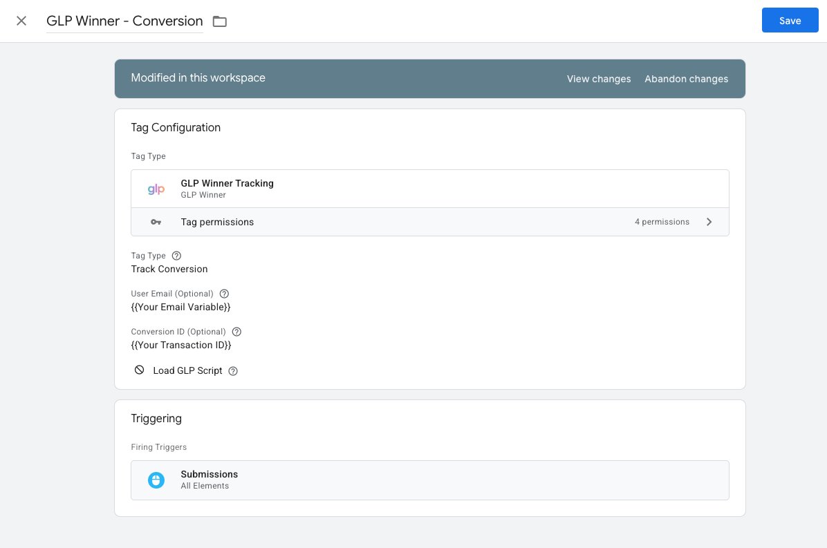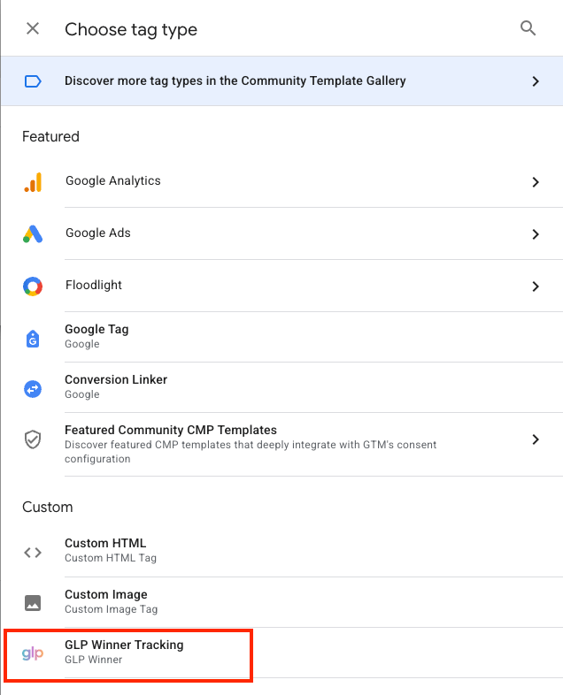 - Choose "GLP Winner Affiliate Tracking" as tag type