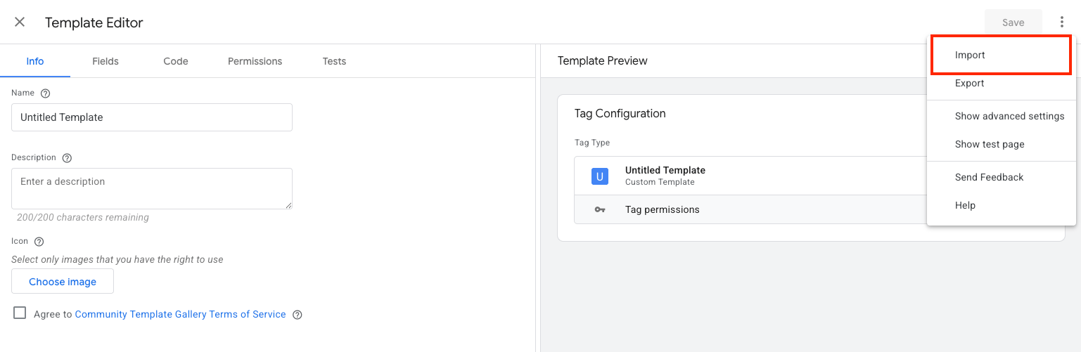 Click the menu (⋮) → Import. Select the downloaded template.tpl file