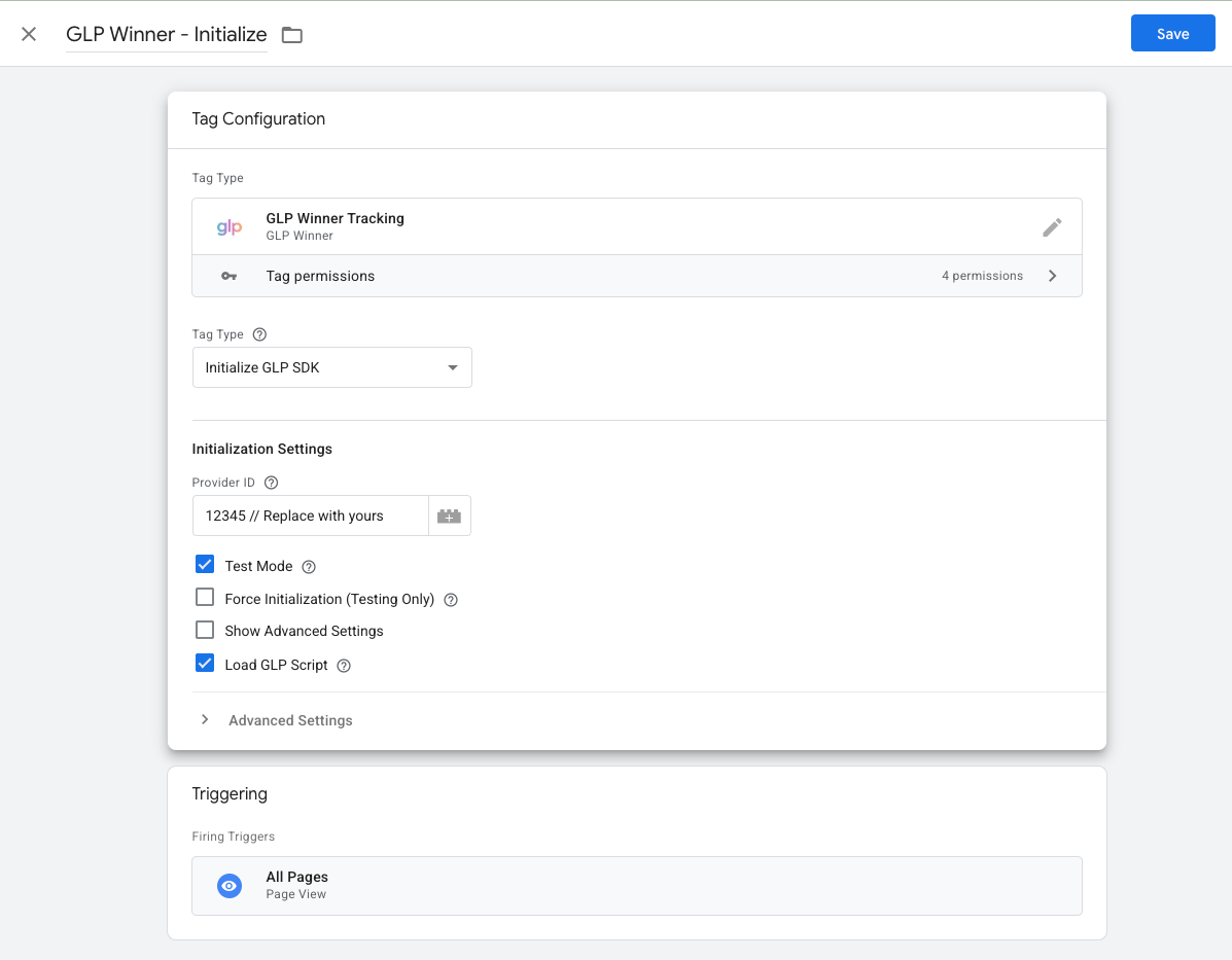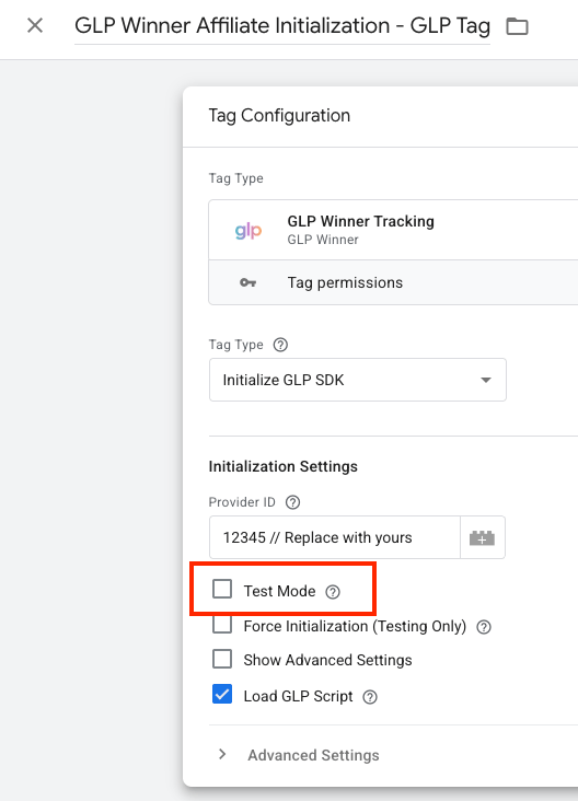 - Load GLP Script: Uncheck (script already loaded by init tag)